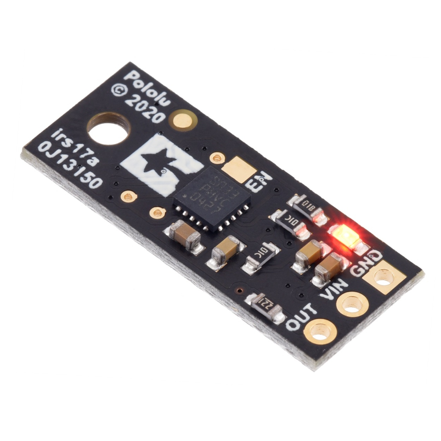 Se necesitan tres conexiones para utilizar este módulo: VIN, GND y OUT. Se puede acceder a estos pines a través de una fila de orificios pasantes con un paso de 0,1″, que funcionan con conectores macho estándar de 0,1″ (2,54 mm) y conectores hembra de 0,1″ (disponibles por separado). El pin VIN debe conectarse a una fuente de 3 V a 5,5 V, y GND debe conectarse a 0 voltios. El sensor emite sus pulsos digitales en el pin OUT. El nivel bajo de los pulsos es 0 V y el nivel alto es VIN. Un LED rojo en la parte posterior de la placa también se enciende cuando se detecta un objeto (cuanto más cerca esté el objeto, más brillante será el LED).