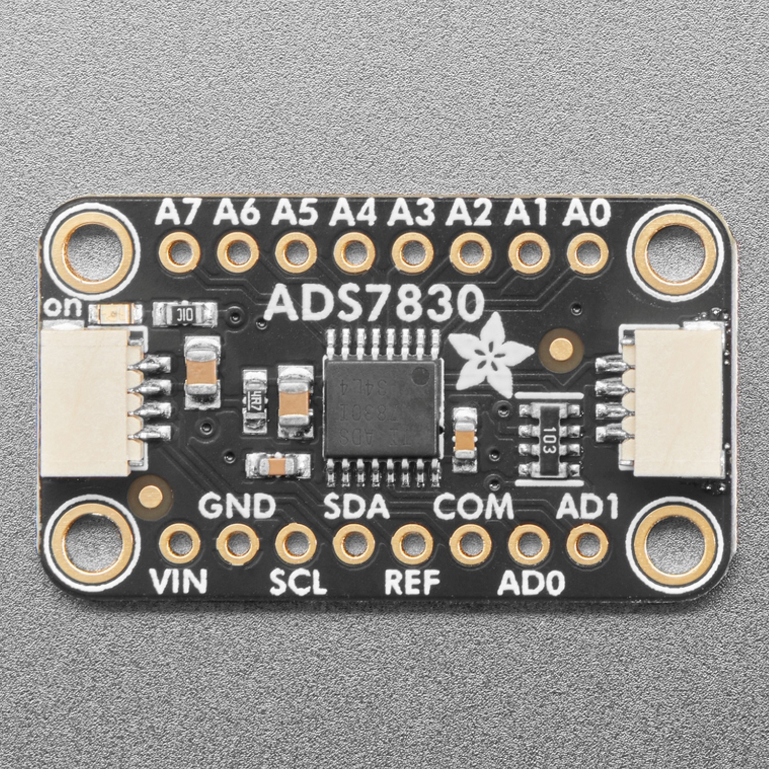 Los conectores STEMMA QT a ambos lados son compatibles con los conectores I2C SparkFun Qwiic. Esto te permite realizar conexiones sin soldadura entre tu placa de desarrollo y el ADS7830 o conectarlo en cadena con una amplia gama de sensores y accesorios mediante un cable compatible.