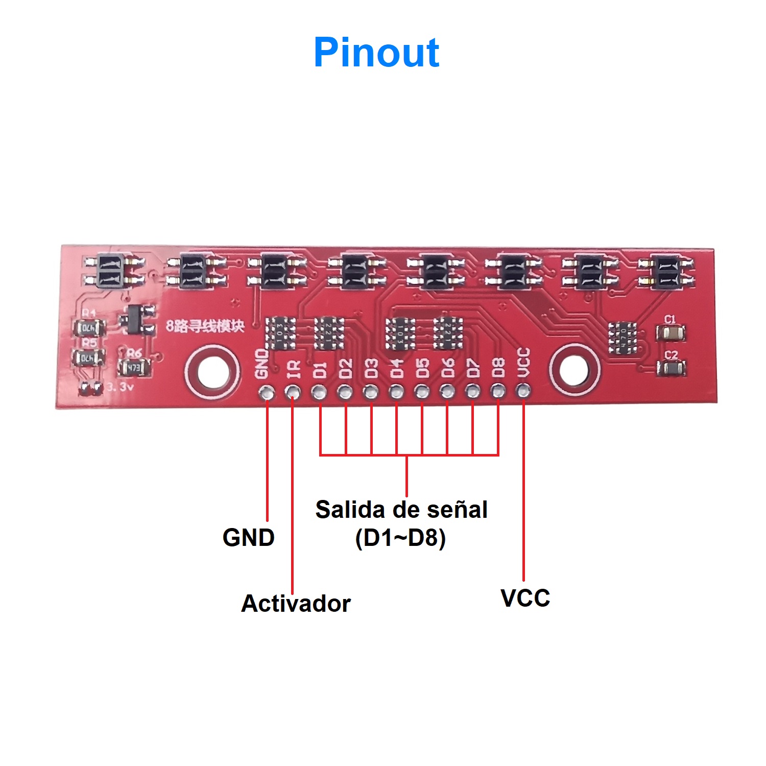 Este sensor analógico es capaz de detectar entre líneas blancas y negras gracias a sus 8 canales. Dependiendo de la precisión que requiera su proyecto cuantas más líneas detecte mayor resolución obtendrá el sensor. Este tipo de sensores se utilizan principalmente en el ensamblado de robots seguidor de líneas.